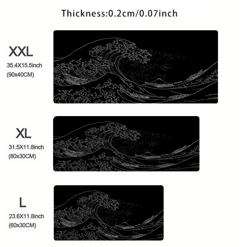 لوحة ماوس XL بتصميم ياباني مستوحى من موجة البحر باللون الأسود تضيف لمسة فنية راقية لمكتبك تتميز بسطح ناعم يوفر حركة دقيقة وسلسة للماوس مع قاعدة مطاطية مانعة للانزلاق مناسبة للألعاب والعمل وتمنح مساحة واسعة لاستخدام لوحة المفاتيح والماوس براحة وأناقة