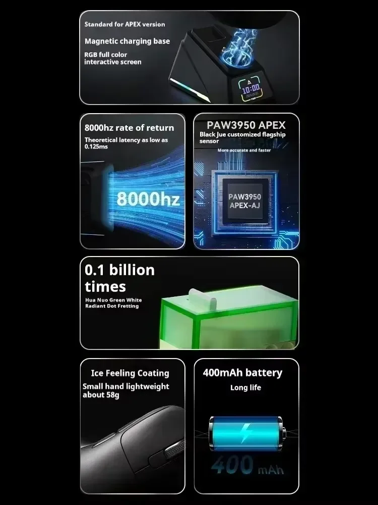 ٦٦٠ماوس الألعاب AJAZZ AJ179 PRO مزود بمستشعر PAW3395 عالي الدقة ويجمع بين الاتصال السلكي واللاسلكي في تصميم خفيف الوزن ومريح للاستخدام الطويل يتميز بقاعدة شحن مغناطيسية عملية وسرعة استجابة ممتازة مع دعم إعدادات ماكرو قابلة للتخصيص مما يجعله خياراً مثالياً للاعبين الباحثين عن الأداء والدقة